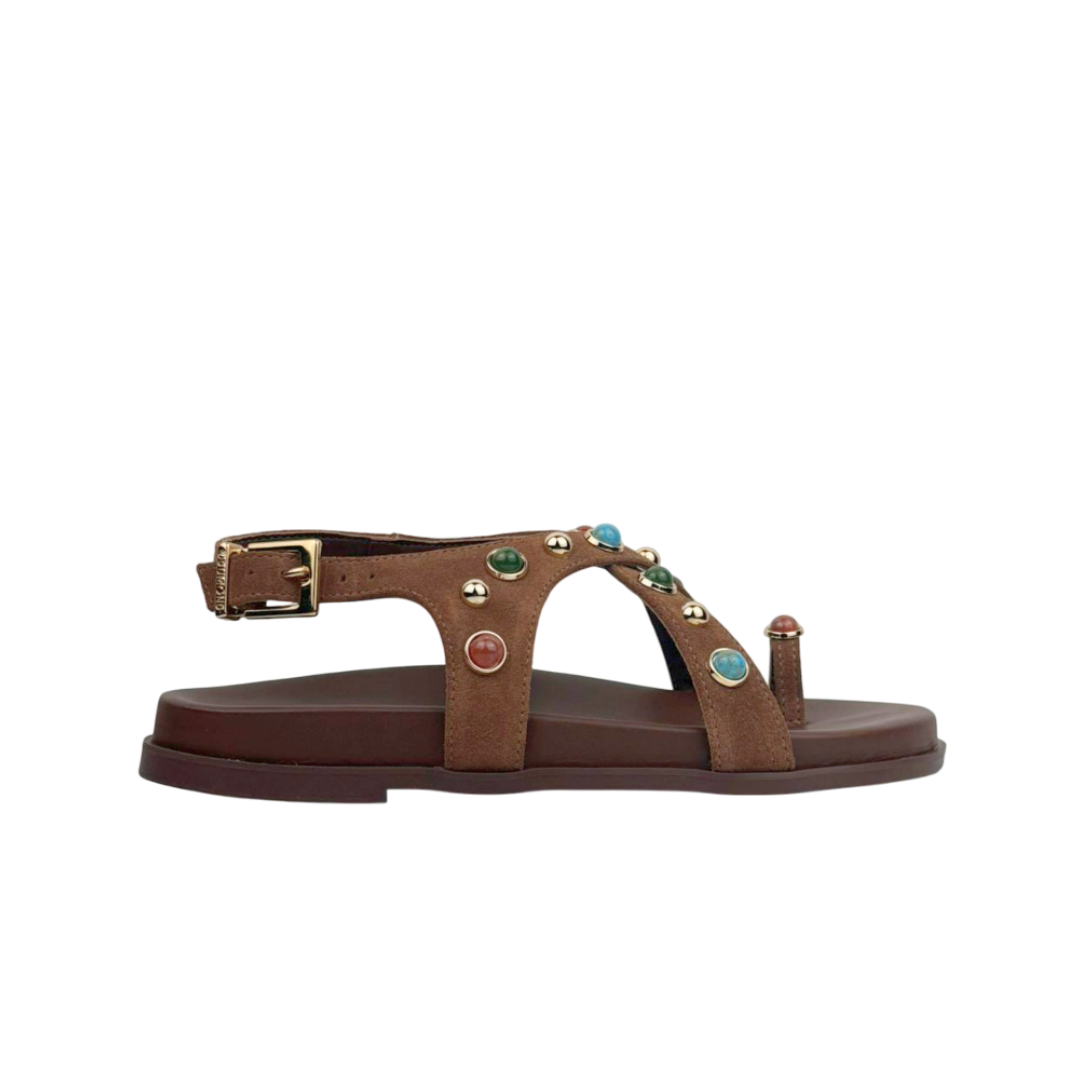 Apresentamos a Papete que transforma o conforto em um acessório de moda. Confeccionada em camurça macia na cor marrom, este modelo de dedo garante o máximo de aconchego para os pés. O grande diferencial reside no design das tiras: elas são ricamente adornadas com uma mistura de tachas metálicas e pedras resinadas de cores vibrantes (turquesa, coral, verde), evocando uma estética étnica e boho-chic refinada.