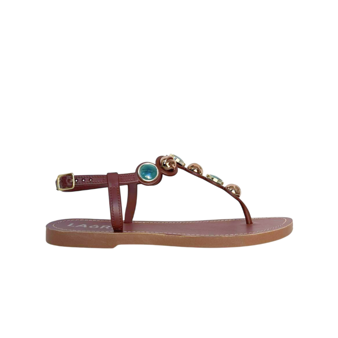 Elegante e versátil, esta sandália rasteira combina delicadeza e sofisticação em cada detalhe. O modelo possui tiras finas em tom marrom que envolvem o pé com leveza, enquanto o cabedal é adornado por aplicações circulares metálicas e pedras em tom perolado, criando um visual moderno e refinado. A palmilha em tom dourado acrescenta um toque luminoso ao design, destacando ainda mais a elegância da peça.