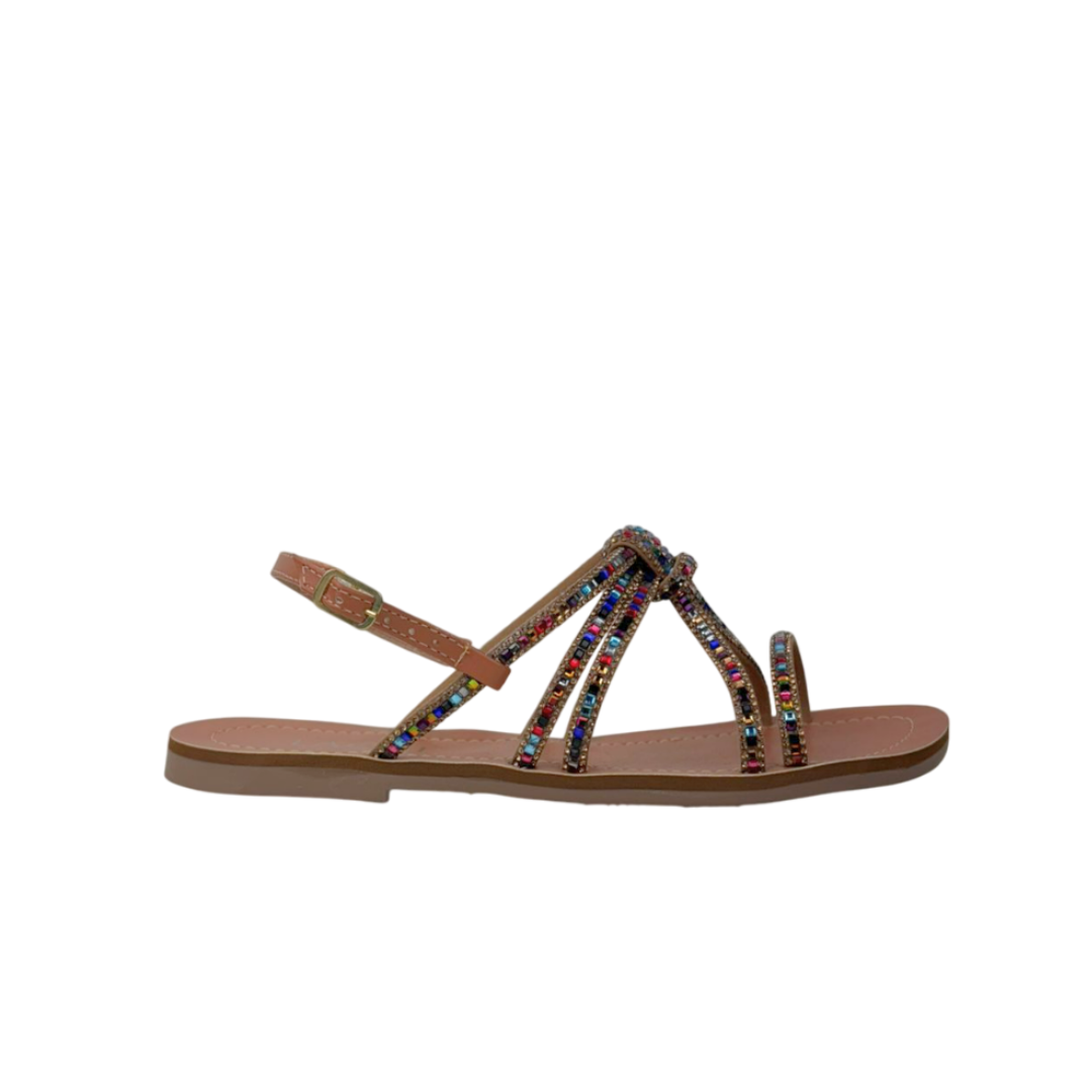 Radiante e delicada, esta rasteira Laóri traduz a alegria do verão em uma versão luxuosa e versátil. Suas tiras finas, adornadas com cristais multicoloridos, capturam a luz a cada passo, criando um efeito vibrante e elegante. A amarração central em nó confere charme artesanal, enquanto o design minimalista garante conforto e estilo em perfeita harmonia.