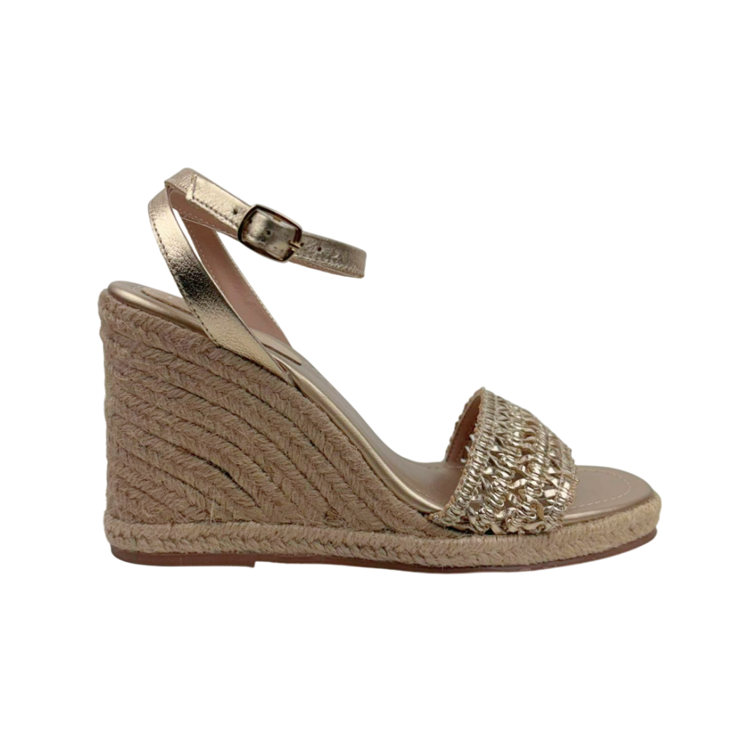 Anabela Espadrille Dourada perfeita para quem busca elegância e conforto, este modelo traz o glamour do acabamento metalizado em ouro, combinado com a leveza da sola em corda trançada. Brilhe em cada passo com a nossa deslumbrante