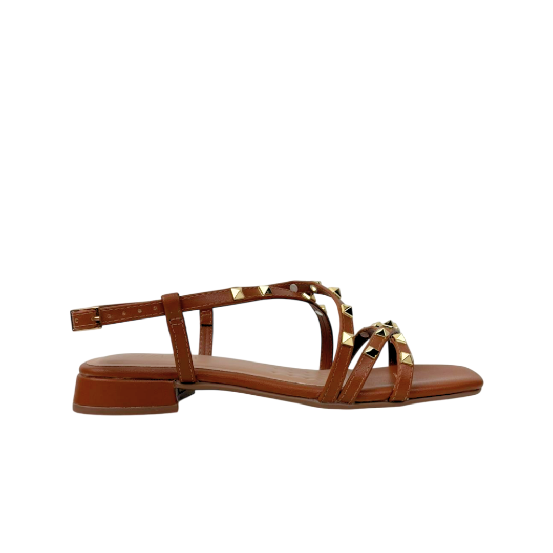 O charme fica por conta dos pequenos studs piramidais em metal dourado, adicionadno um brilho rock-chic na medida certa. Com salto bloco sutil e bico moderno, ela garante conforto sme abrir mão do estilo, sendo perfeita para transita de um almoço casual a um happy hour sofisticado.