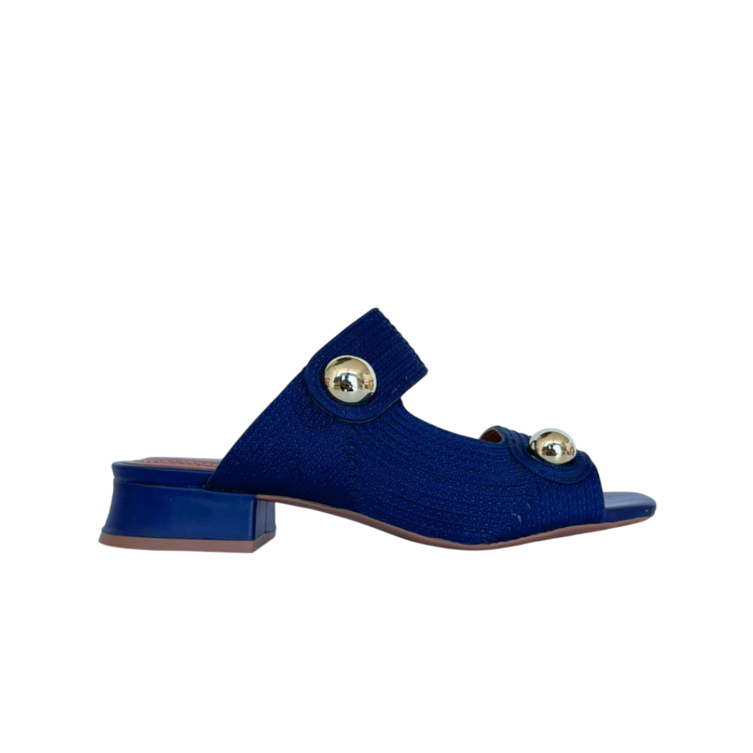 Com design contemporâneo e sofisticado, este tamanco azul marinho é a escolha ideal para quem busca estilo e conforto em um só produto. O destaque fica por conta da tira em textura tramada, que traz um visual moderno e diferenciado, combinada às aplicações metálicas douradas que adicionam elegância e um toque de luxo ao modelo.