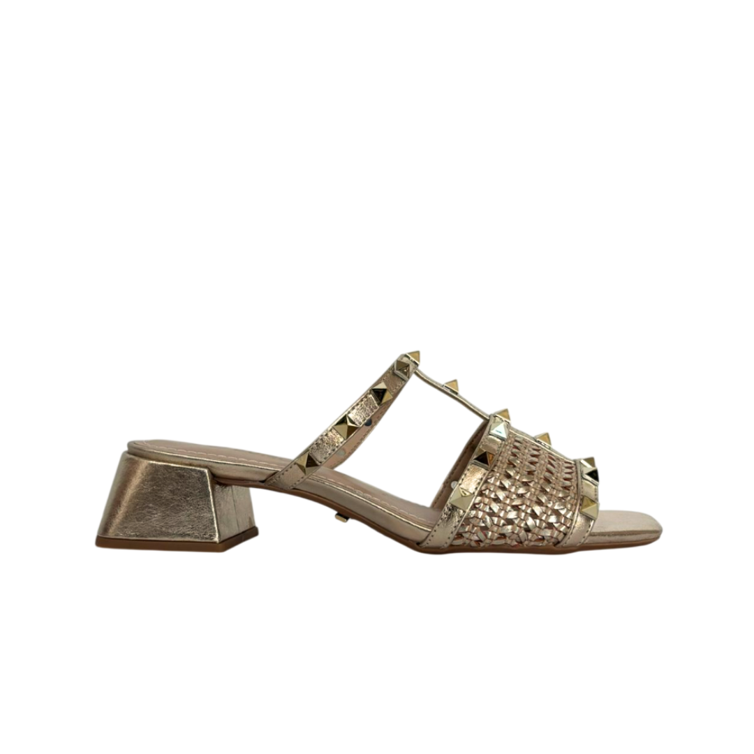 Tamanco em tom ouro, que traduz elegância e personalidade em cada detalhe. Confeccionado com acabamento metalizado sofisticado, o modelo possui tira frontal com trama delicada, enriquecida por tachas douradas que acrescentam um toque moderno e fashionista ao visual. As tiras finas com aplicações metálicas valorizam o design e garantem charme extra à composição.